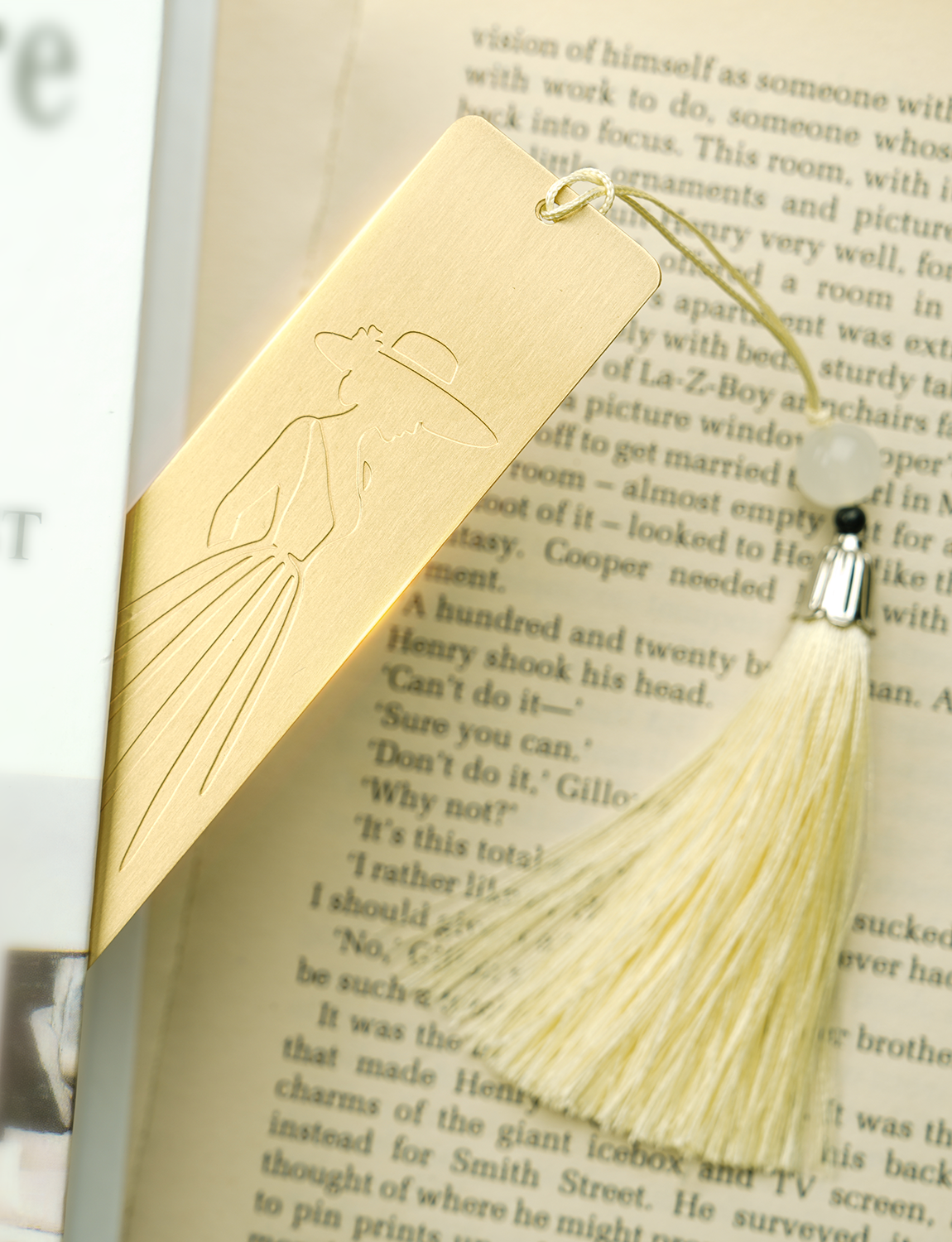 - 🎨 Artistic Line Art Design: This brass bookmark features a minimalist illustration of a stylish woman in a flowing dress and hat, blending elegance with timeless simplicity. A perfect match for aesthetic-minded readers.
